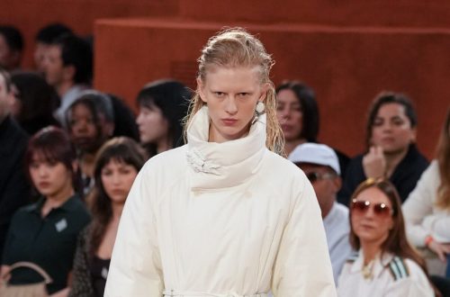 There were deconstructed pink velour tracksuits too, and some of the models nursed small beaten-up teddy bears on their sleeves, but any softness was neutralized by the dangerous-looking silver claws from Tokyo-based jewelry designer Fangophilia. Kimura, who has bleached hair and eyebrows and wears a lot of body-con black, said of her aesthetic: “I like to look serious rather than fun.”